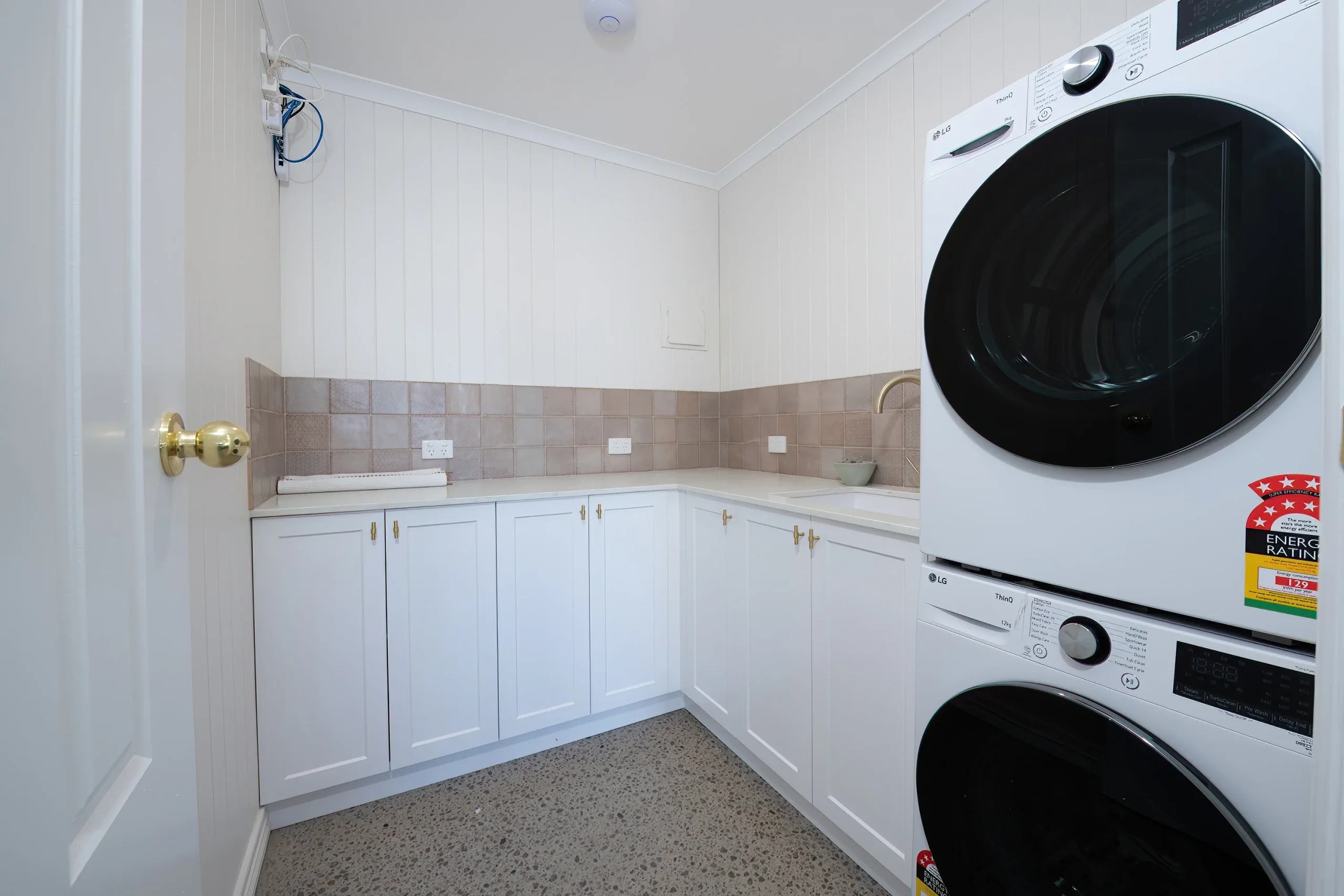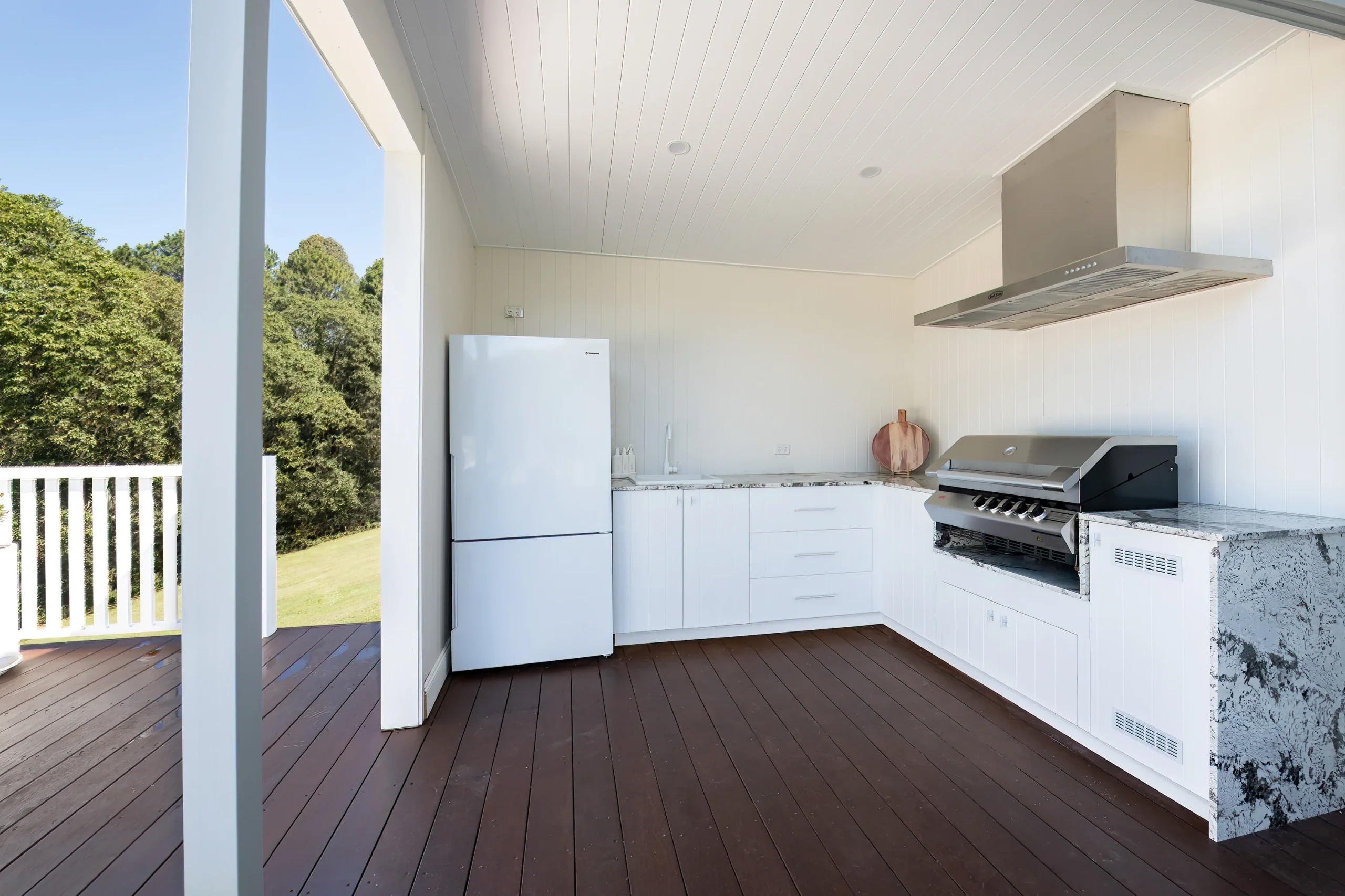 Downstairs offers even more space. The living area is ideal for relaxing with a book or sharing time together. For outdoor dining, there’s a covered BBQ and cooking area, complete with an entertaining deck. In the evenings, gather around the fire pit for stories and stargazing.